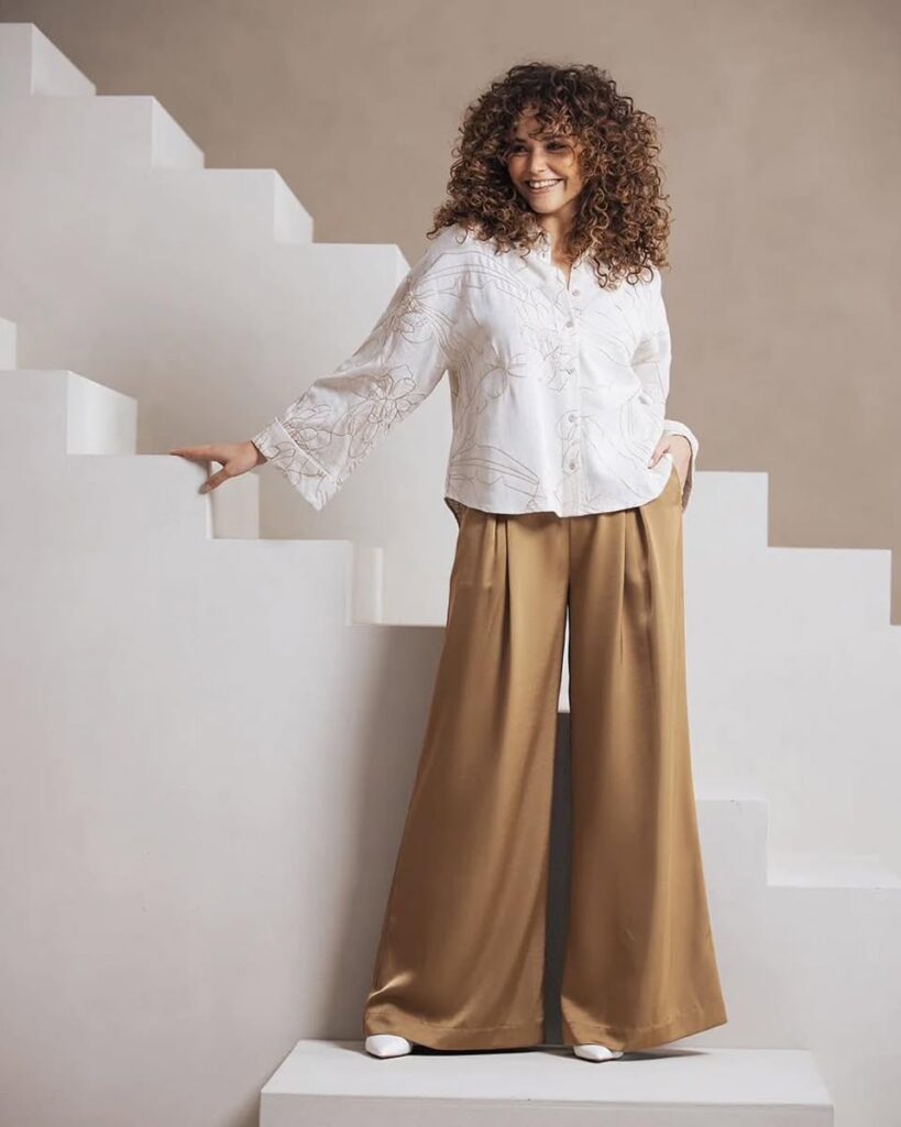 Deze prachtige set is van LabeL DOT. De broek is effen en heeft een subtiele gouden glans en de blouse is afgewerkt met gouden details.