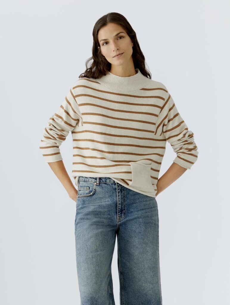 De trui heeft een kleine turtle hals, is mooi van lengte & draagt heerlijk warm! Door de opgestikte zak en offwhite/camel kleuren krijgt die een casual look.