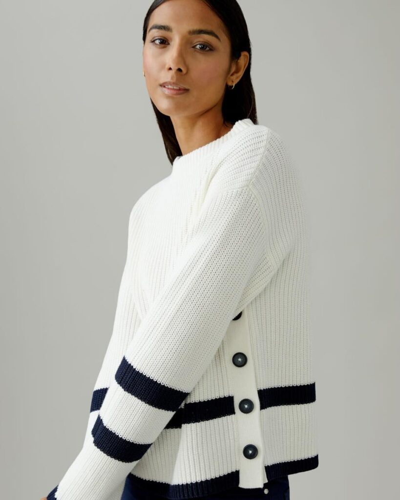 Hij is gemaakt van 100% katoen en heeft een wijdere pasvorm. De kleurencombinatie off white met donkerblauw maken dit een stijlvolle, maar sportieve trui.