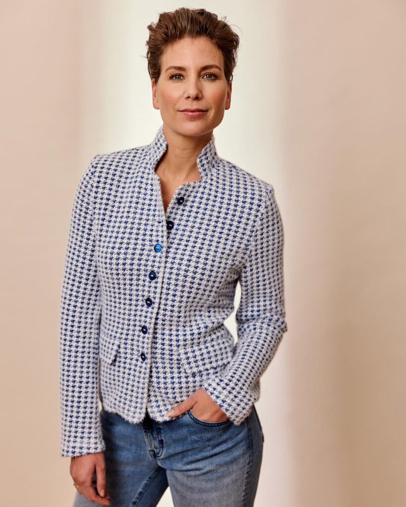 Dit prachtige blauwe ruitje jasje is ongevoerd en draagt als vest, ideaal voor verschillende gelegenheden. In de winkel hebben we nog veel meer kleuren, dus kom gezellig langs!